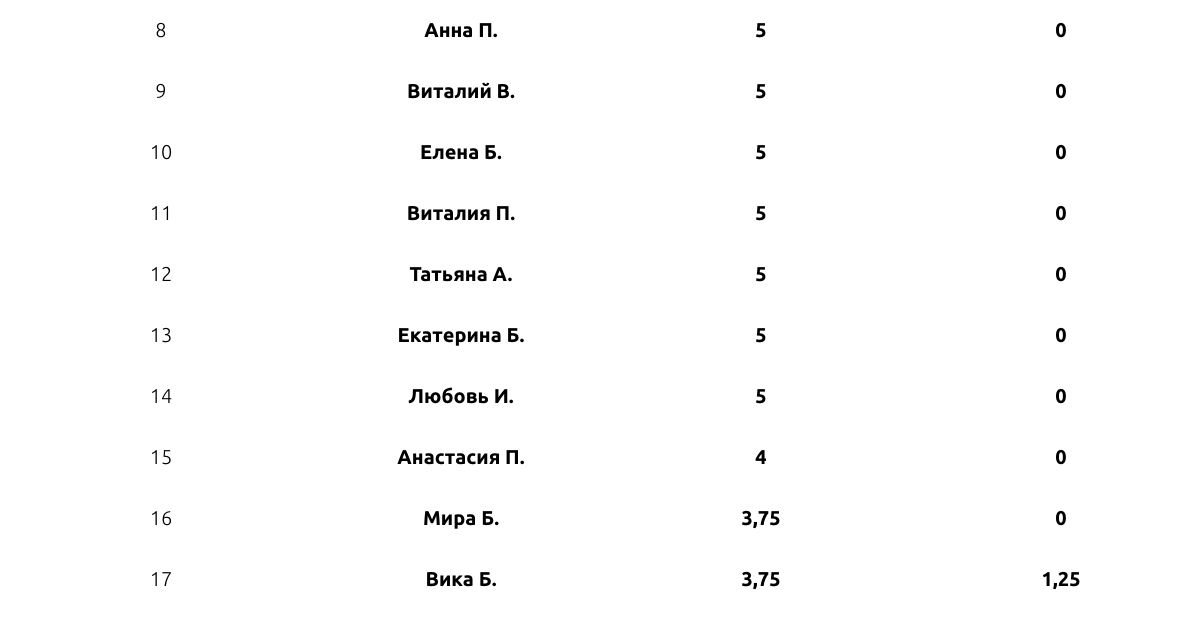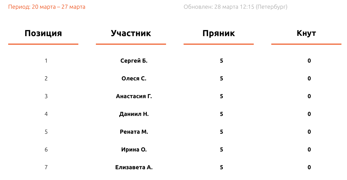 Мы проставляем кнуты и пряники в рейтинг каждый день около 12 часов по полудни по Петербургскому времени. Поэтому, к примеру, задание за вторник считается просроченным, если Вы его сдали позднее 12.00 среды (следующего дня). Тем не менее, мы хотим, чтобы вы пытались выполнить задания, вне зависимости от дедлайна. Поэтому, если Вы в течение текущей недели присылаете заданное, мы не ставим ни кнут, ни пряник – 0.